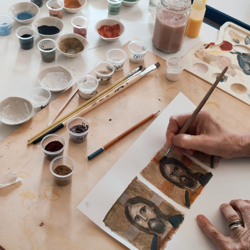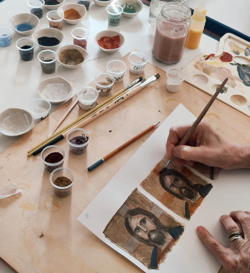 Il corso elementare di disegno dà un’idea delle proporzioni di base del viso, del collo e della figura a mezzo busto. Nel corso base di pittura di icone abbiamo lavorato senza un modello e lo scopo era quello di capire i principi base della costruzione del volto e di essere in grado di disegnarlo, e di poterlo ricostruire anche se qualche elemento è andato perso. Abbiamo disegnato a matita, studiato le peculiarità della lavorazione della tempera all’uovo e dipinto il volto col colore. Il lavoro del corso non implicava la realizzazione di un’icona finita e si basava su un gran numero di esercizi da realizzare con matita e tempera.