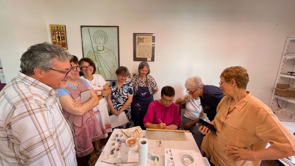 I corsisti del primo anno si sono cimentati in esercitazioni grafiche, di composizione, sull’uso dei materiali (tavola e colori), al fine di acquisire le abilità tecniche di base del linguaggio pittorico e simbolico dell’icona, e hanno studiato il valore del calco per il lavoro iconografico. Gli allievi che l’estate scorsa avevano iniziato a lavorare sulla tavola e sul disegno, hanno portato a termine l’icona di Cristo pantocratore, una delle più importanti e significative perché aiuta l’iconografo a incontrare e dipingere il volto di Cristo. Gli allievi del corso più avanzato hanno invece approfondito e lavorato sull’iconografia dell’angelo.