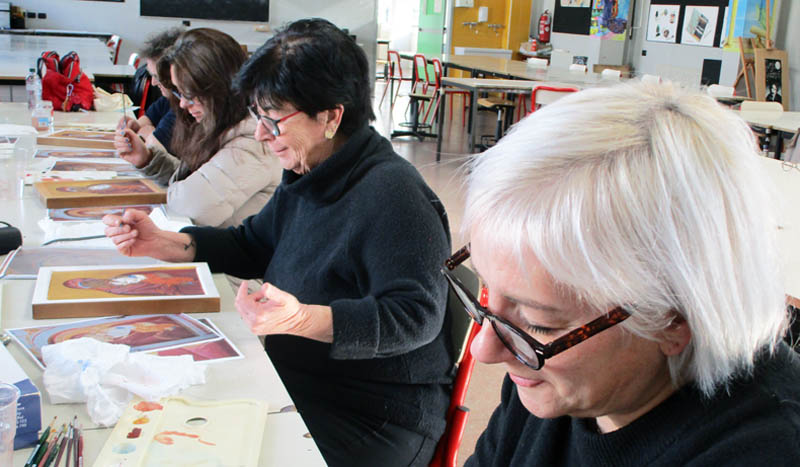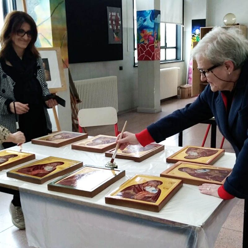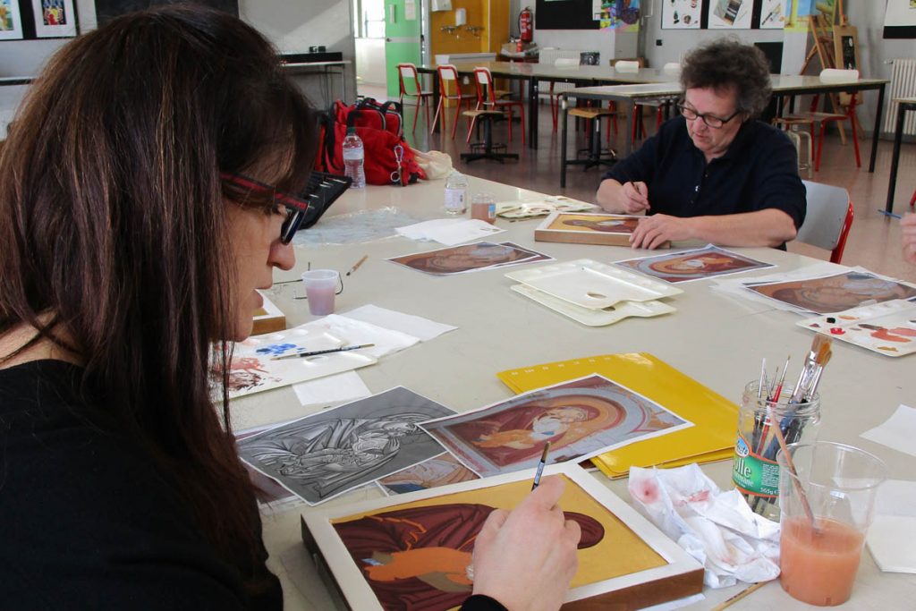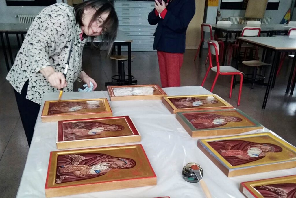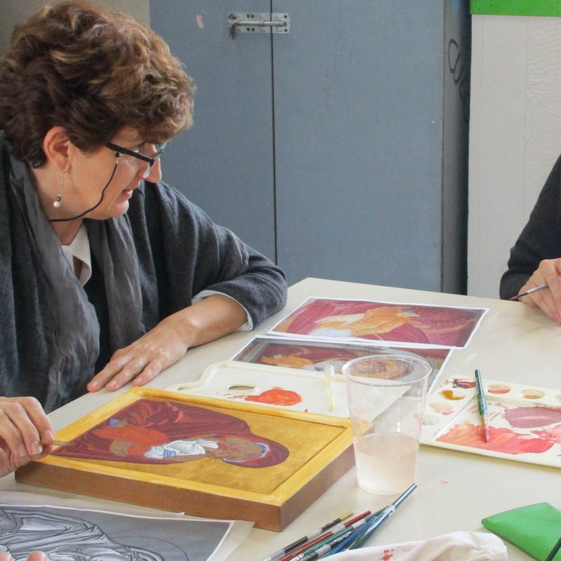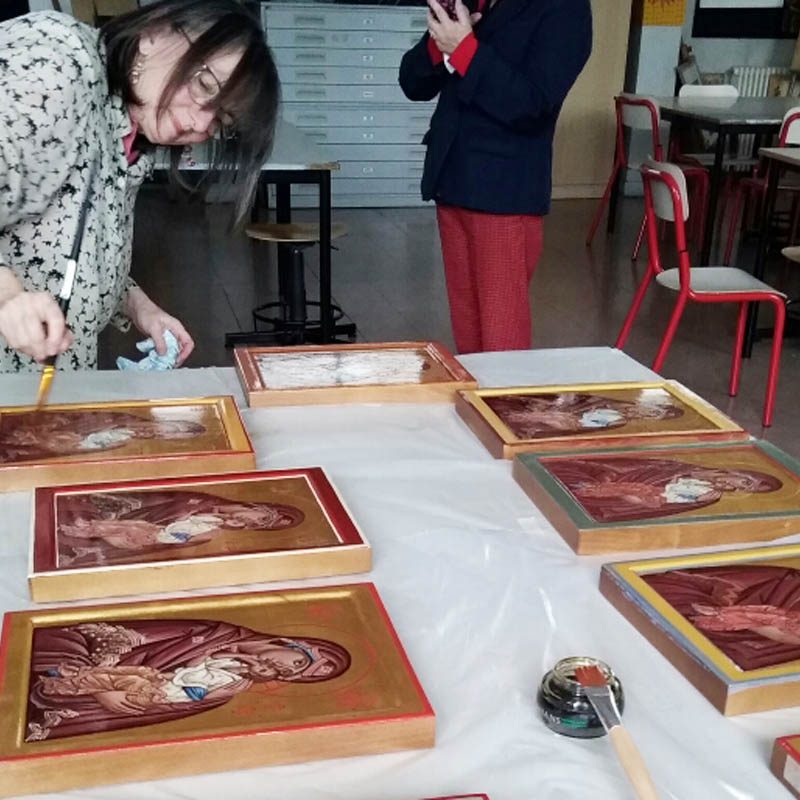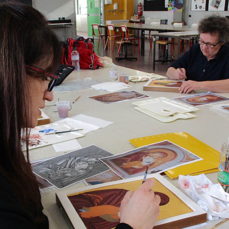 Abbiamo realizzato due icone, raffiguranti rispettivamente un Cristo Pantocratore e una Madonna della Tenerezza. L’acquisizione delle tecniche operative, l’uso dei materiali, la doratura, la scrittura, la verniciatura hanno avuto lo scopo di chiarire ai partecipanti dei corsi che l’icona è composta di un linguaggio fatto di simboli che concorrono ad esprimere la realtà divina.