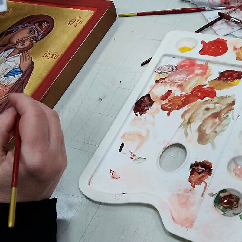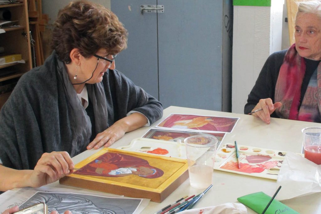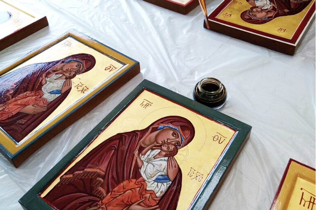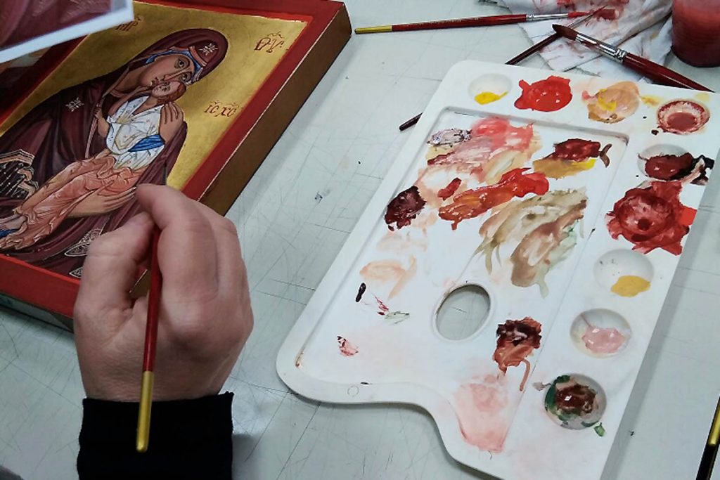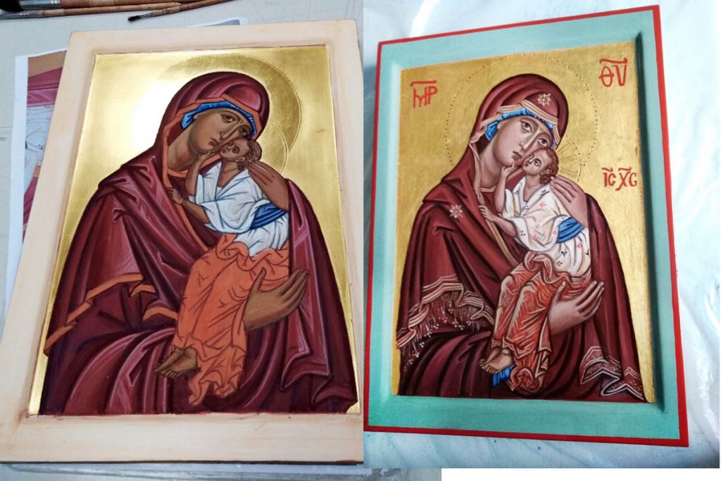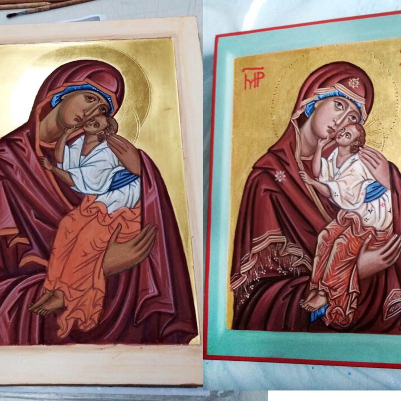 Abbiamo realizzato due icone, raffiguranti rispettivamente un Cristo Pantocratore e una Madonna della Tenerezza. L’acquisizione delle tecniche operative, l’uso dei materiali, la doratura, la scrittura, la verniciatura hanno avuto lo scopo di chiarire ai partecipanti dei corsi che l’icona è composta di un linguaggio fatto di simboli che concorrono ad esprimere la realtà divina.
