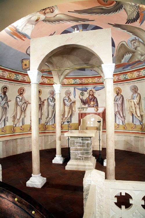 La crocifissione con Cristo rivestito di questa tunica è l’immagine centrale nel presbiterio della cappella della Decollazione di san Giovanni Battista a Semchoz, costruita proprio sul luogo in cui, sul sentiero che conduceva alla stazione, padre Aleksandr Men’ fu colpito da un colpo di scure per mano di assassini rimasti ignoti. Questo edificio fa parte del complesso memoriale di cui abbiamo già ricordato la chiesa di San Sergio, ma è stato decorato da padre Zinon in uno stile completamente diverso. Siamo nuovamente in presenza di uno stile che non assomiglia per niente a quello che si considera generalmente tradizionale per le chiese ortodosse, perché qui Zinon ritorna alle falde più antiche della tradizione, all’epoca in cui l’arte cristiana era alla ricerca di un nuovo linguaggio, fecondando il terreno della cultura antica con lo spirito del Vangelo – come ha osservato ancora la Jazykova. Per questo lo stile degli affreschi della divisoria d’altare ricorda le pitture pompeiane; l’Agnello raffigurato in alto ricorda i mosaici delle antiche chiese romane; il giovane Mosè, Aronne con la verga fiorita, Isaia con il rotolo sono ammantati di toghe classiche… Uno spettacolo insolito, forse, ma che rimanda continuamente alla speranza insita nella Resurrezione.