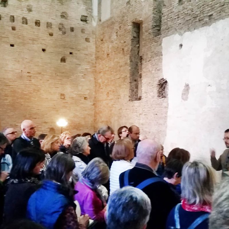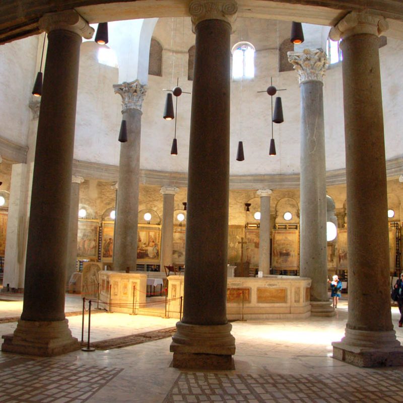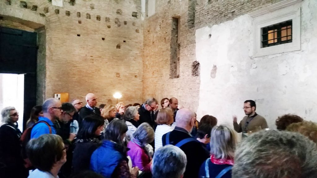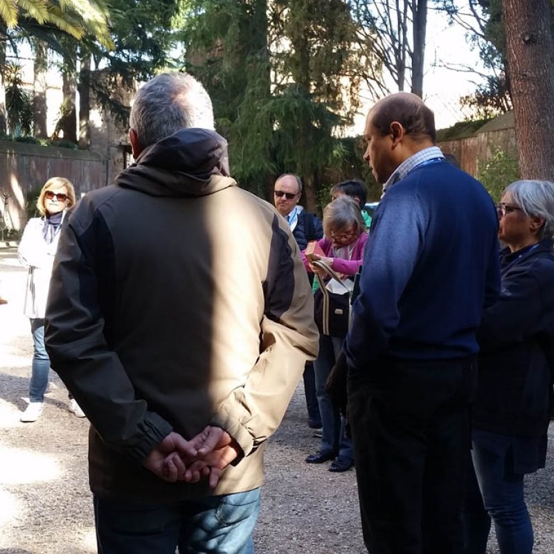 L’abbiamo constatato, in particolare, visitando Santo Stefano Rotondo: una chiesa del V secolo a pianta circolare, costituita in origine da tre cerchi concentrici che iscrivevano nella pianta circolare una croce greca, e che presenta analogie con la pianta della Rotonda (Anastasis) della basilica del Santo Sepolcro a Gerusalemme. A guidarci qui è stato Emanuele Gambuti, giovane esperto dell’Associazione «Pietre vive», che oltre a farci rivivere gli esordi del culto dei martiri e la presenza di papa Gregorio Magno (che qui predicò e al quale viene attribuita la cattedra tuttora conservatasi, un sedile in marmo di epoca romana), ci ha fatto gustare la devozione per i martiri – in primis il Crocifisso – sviluppata nella seconda metà del XVI secolo dai gesuiti lungo tutto il perimetro della chiesa attraverso gli affreschi del Pomarancio e gli scritti di meditazione di sant’Ignazio di Loyola riportati a fianco delle pitture.