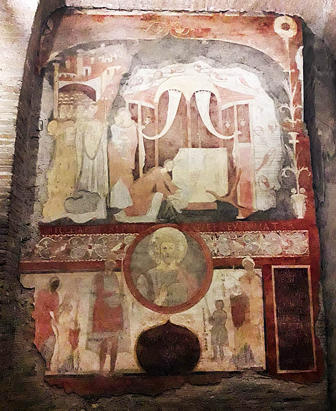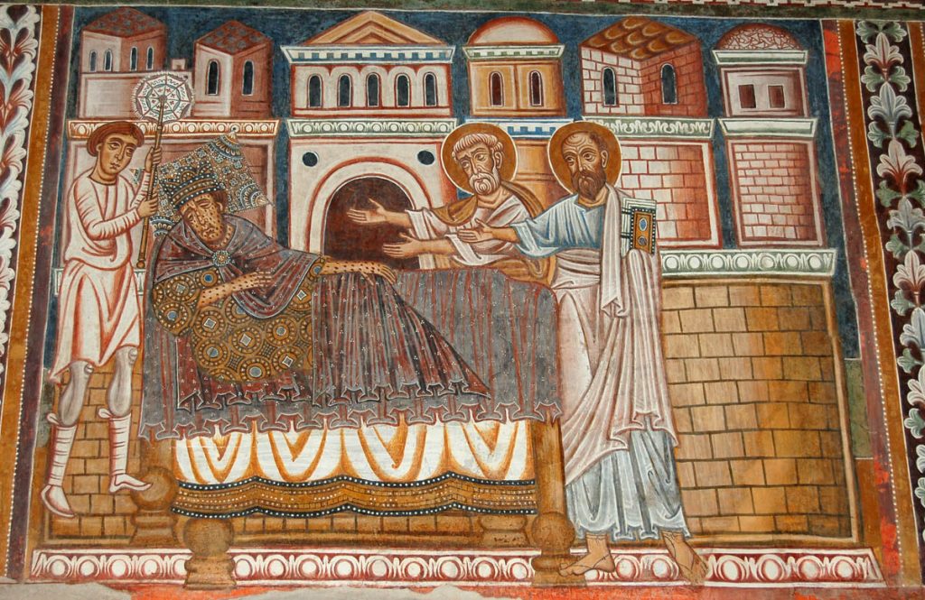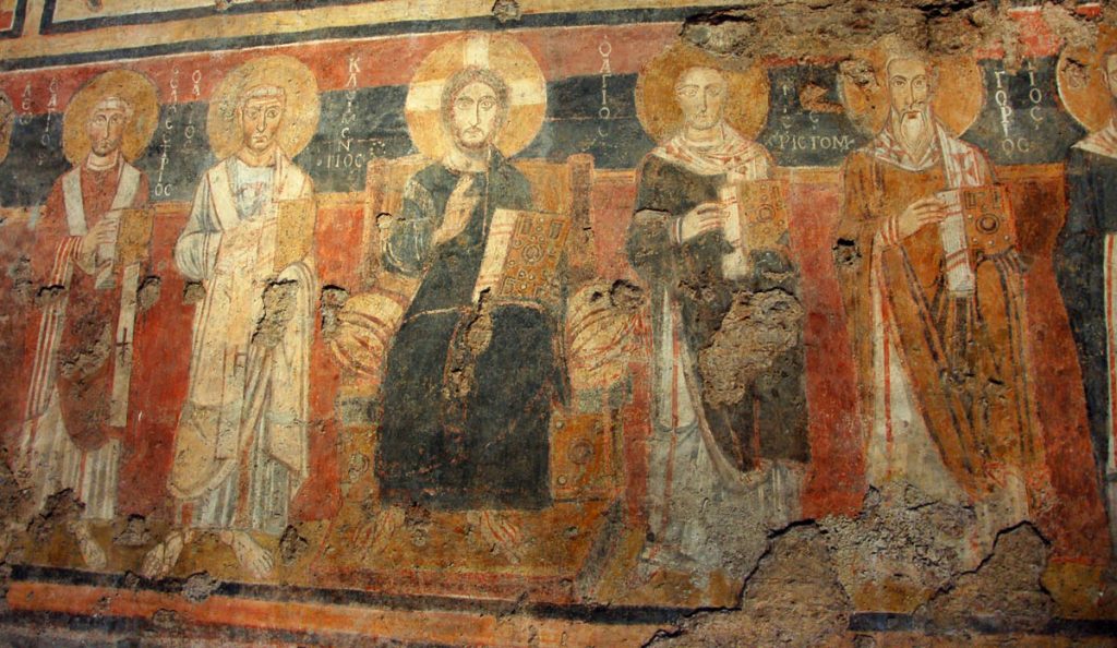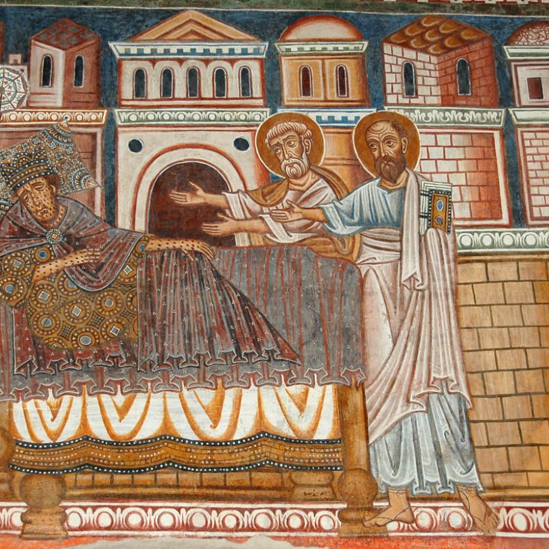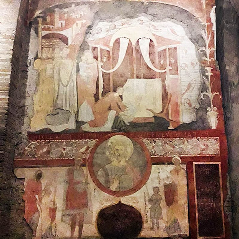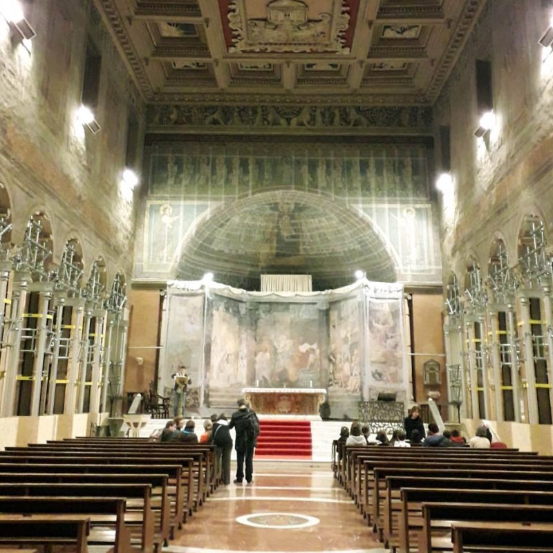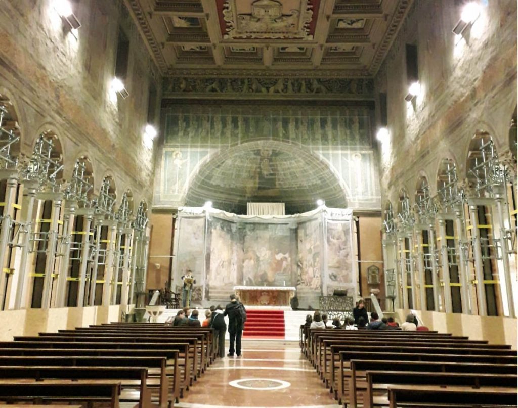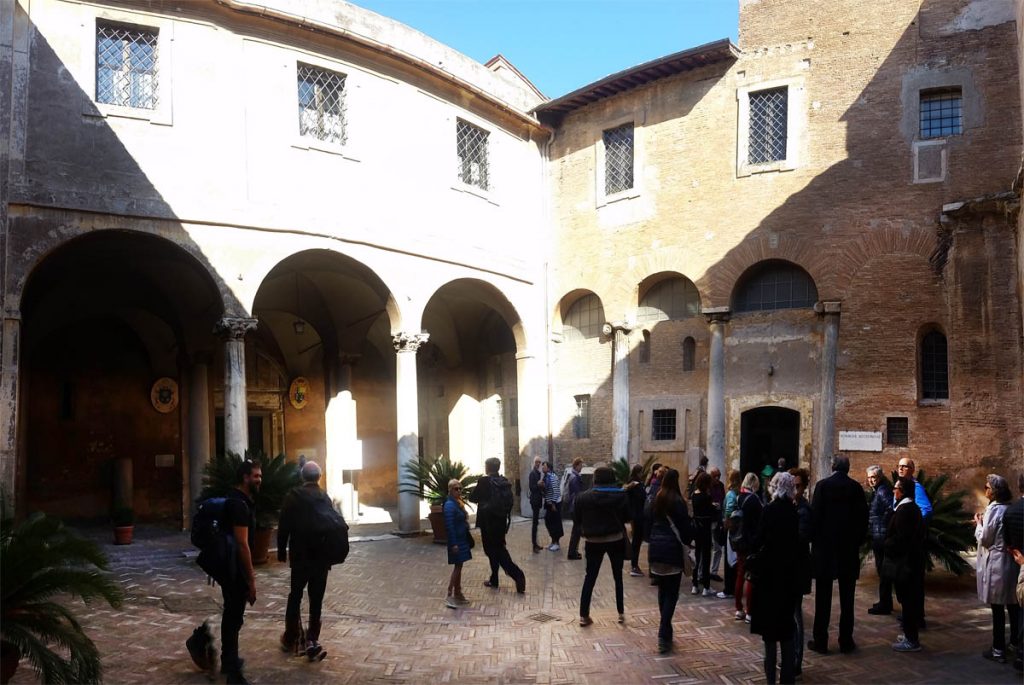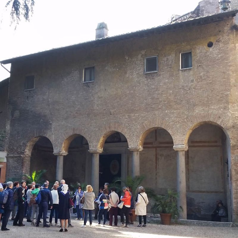 La domenica mattina, visita all’Oratorio di San Silvestro nel complesso dei Santi Quattro Coronati (attualmente monastero agostiniano), affrescato nel 1248 da artisti bizantini. Si tratta di un ciclo di 11 scene pitturiche, che illustrano gli Acta Silvestri con la vita leggendaria dell’imperatore Costantino e la sua conversione attraverso la visione dei Santi Pietro e Paolo. È la riaffermazione dell’autorità papale in un momento in cui il potere imperiale minacciava la stessa istituzione del papato, ma è interessante notare come nella Chiesa l’autorità – nella sua concretezza – si basi sulla persona di Cristo, che campeggia al centro del ciclo pittorico, e degli apostoli Pietro e Paolo a cui Egli affida la sua Chiesa. Proprio a questo bellissimo ciclo di pitture si rifanno gli autori degli affreschi di San Piero a Grado (Pisa), che ci siamo recati a visitare l’anno scorso.
