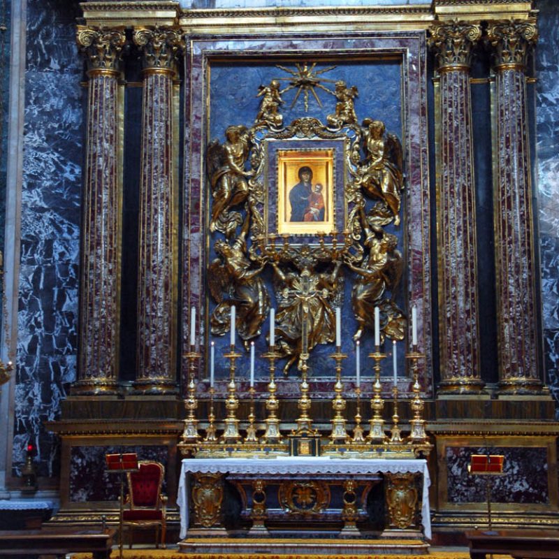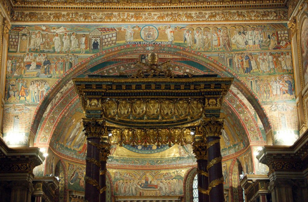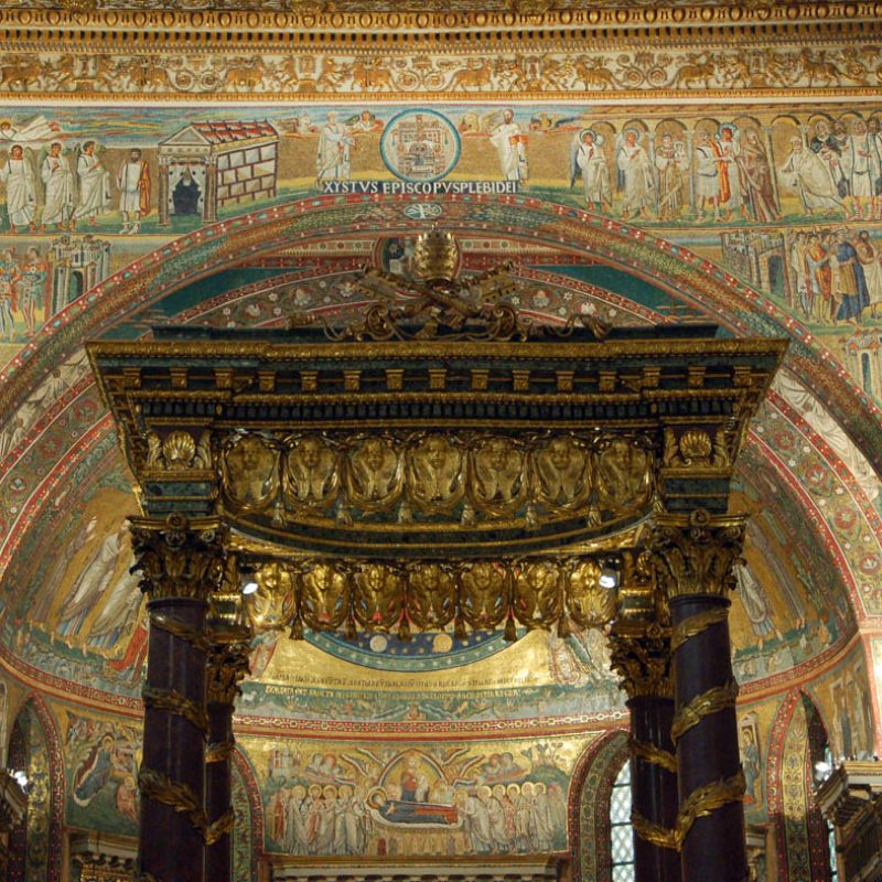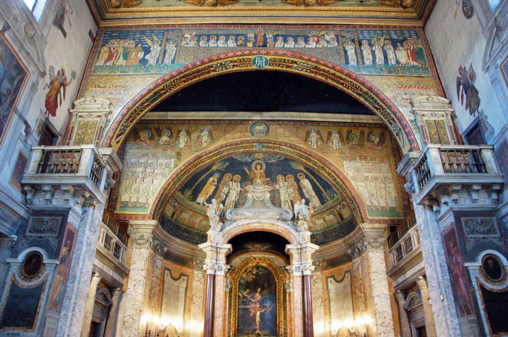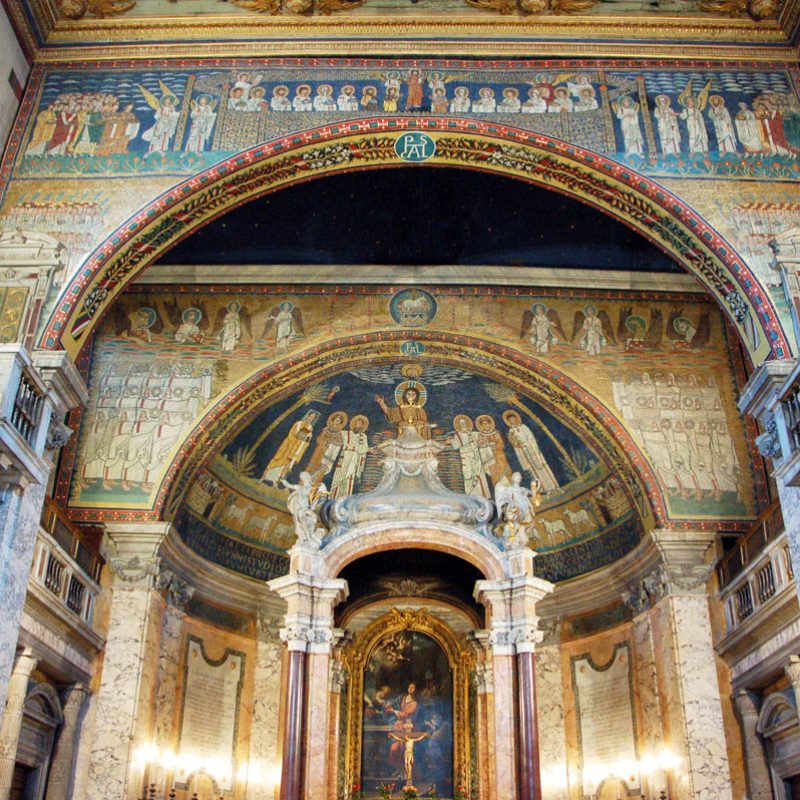 Da ultimo, visita a Santa Prassede, con i suoi splendidi mosaici. È una delle chiese volute da papa Pasquale I (IX sec.) per tener desto il culto dei martiri (di Prassede, sorella di Pudenziana, come lei morta martire, si dice che andasse sui luoghi del martirio dei suoi contemporanei per raccoglierne con una spugna il sangue prezioso – seme di nuovi cristiani). La ripresa del mosaico per opera di papa Pasquale è dovuto all’accoglienza di Roma agli artisti che fuggivano in quel periodo da Bisanzio in seguito alle persecuzioni iconoclaste.