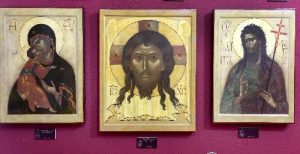 In primo piano, tra le opere esposte, il Salvatore dell’archimandrita Zinon.